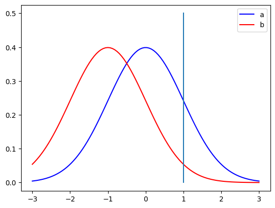 예를 들어 아래와 같이 a, b라는 확률분포가 있을 때, X=1인 확률변수가 있다고 하자.
